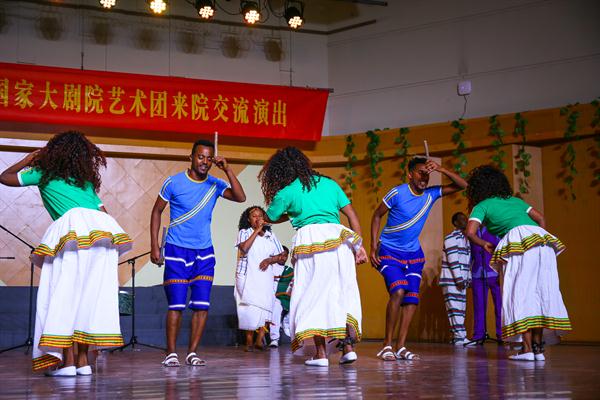 由歌唱家、舞蹈家和演奏家组成的20多位埃塞俄比亚国家剧团成员在我校师生的热烈欢迎和引导下参观了浙艺。戏剧系同学敏捷的身手、舞蹈系同学优美的舞姿、音乐系同学清亮的歌喉以及文管系同学的手工创意作品都令外宾们惊叹不已。埃塞俄比亚剧团在浙艺音乐厅展演了一场富有民族特色又热情洋溢的歌舞剧,整部剧分为几个小剧目,由四种不同的乐器演奏,五个歌手轮流主唱,服饰缤纷靓丽。演员们还带来了特技表演:跳跃打鼓、甩头舞等高难度动作,演员们还邀请浙艺师生与他们结成队伍,一起欢呼,一起谢幕。