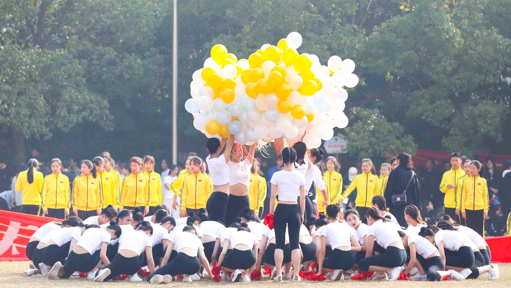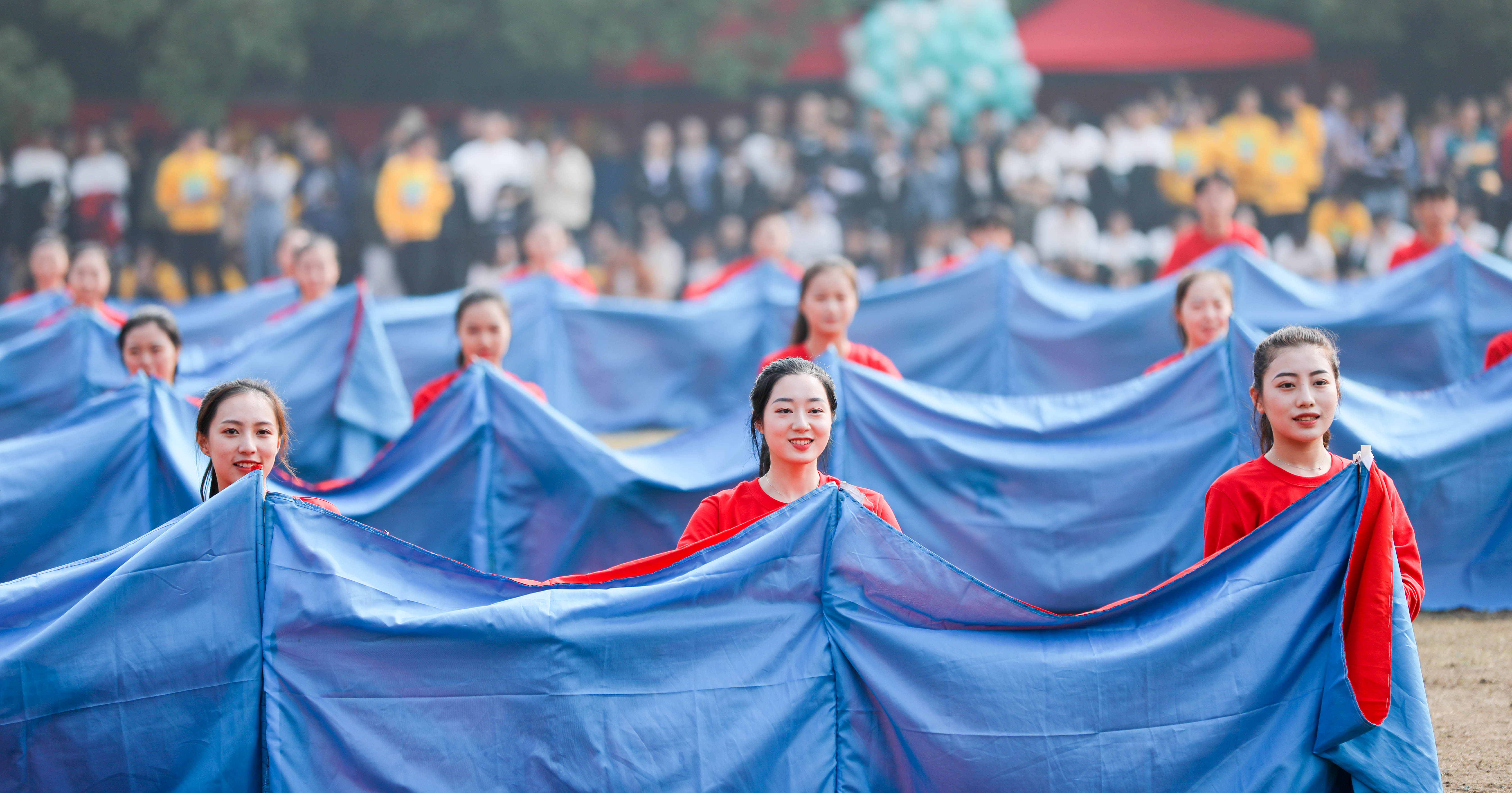 在充满激情的运动员进行曲中,由各系师生组成的代表团迈着整齐一致的步伐迈入田径场,诠释着“全民全运”的魅力。各系的入场表演精彩纷呈,各有特色,美术系的汉服秀彰显中华传统服饰的特色文化,文化管理系的打伞舞将江南女子的温婉气质展现得淋漓尽致,戏剧系、舞蹈系自信展示优雅舞姿,影视技术系以啦啦操舞为赛场增添活力,音乐系同学手上的气球诉说着放飞理想的青春朝气。江南忆,最忆是浙艺,天公作美碧空现,骄儿洒汗壮志酬。