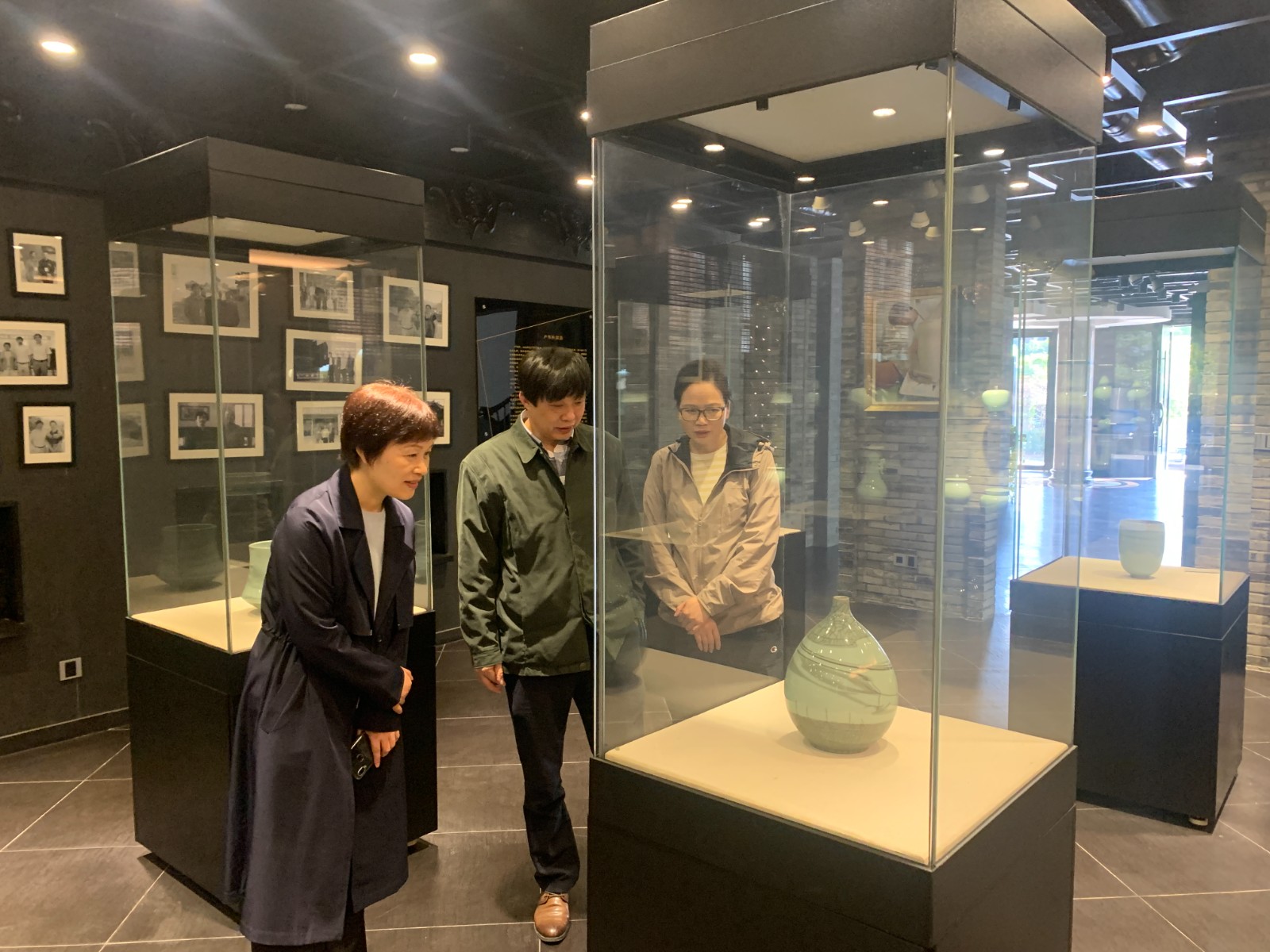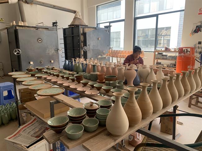 随后,金银琴一行到了青子瓷艺,这也是学校的校企合作实践基地。陈少青介绍了青子瓷艺工作室是以开发青瓷艺术瓷,精致实用瓷为主要经营思路,在继承传统工艺基础上推陈出新,力求把每件作品都以精湛的工艺手法与美术相结合,尽可能烧制出独特而具有艺术魅力的作品。参观之余,双方也希望保持、深化合作,共同开展技艺传授和实践教学。同时,陈少青老师曾经与学校开展的非遗研培成果也将在近期即将推出的手工艺教学成果展中展出。