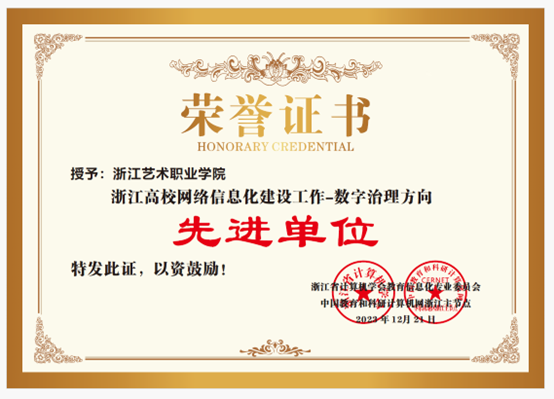 近日,浙江省计算机学会教育信息化专业委员会、中国教育和科研计算机网浙江主节点联合表彰了一批2023年高校网络信息化建设先进单位和先进个人。我校喜获“2023年浙江高校网络信息化建设先进单位-网络安全方向”“2023年浙江高校网络信息化建设先进单位-数字治理方向”两项荣誉,图书信息中心卓然荣获“浙江高校网络信息化建设先进个人”。